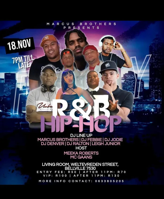 Marcus Brothers on Friday night presents RnB and hip hop with a kwaai line-up featuring Marcus Brothers, Leigh-Junior, DJ Ralton, DJ Jodie and many more rocking the decks live at the Living Room in Weltevreden street, Bellville.