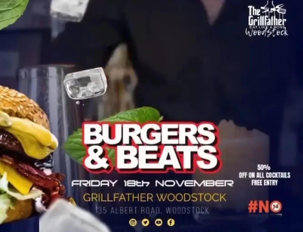 Stiek uit at the Grillfather in Woodstock and join them for Burgers and Beats, entry is verniet and they’re giving you 50% off on all cocktails all night. Strictly no under 18s.