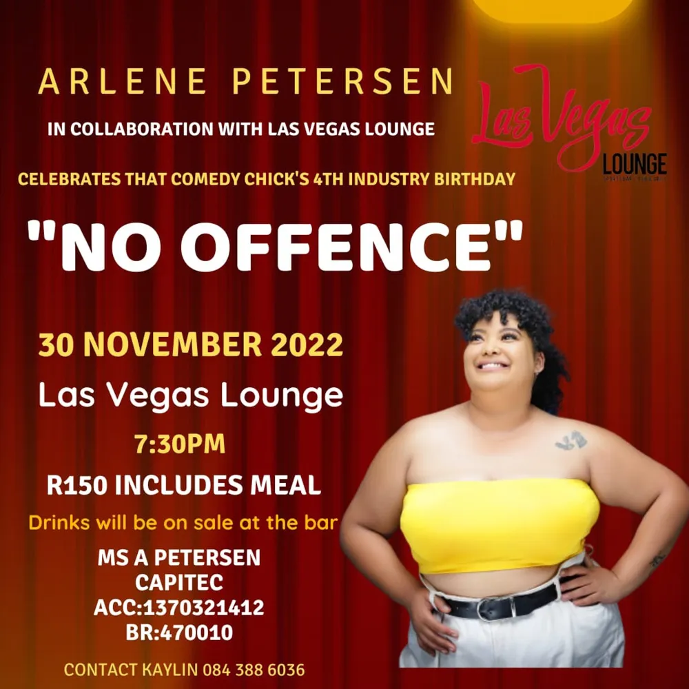 Comic Arlene Petersen will be hosting her ‘fourth industry birthday’ titled No Offence at the Las Vegas Lounge in Mitchells Plain.Tickets cost R150 and include a meal, drinks will be available at the bar. The laughter starts at 7.30pm.