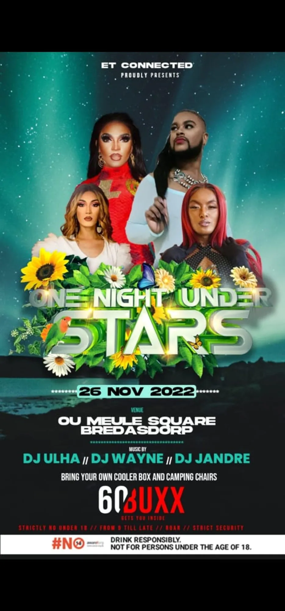 Tickets cost R120 per person, food and beverages will be on sale. Doors open at 8pmET Connected presents One Night Under The Stars on Saturday at Ou Meule Square in Bredasdorp featuring DJ Ulha, DJ Wayne and DJ Jandre. Bring your own cooler box and camping chairs.