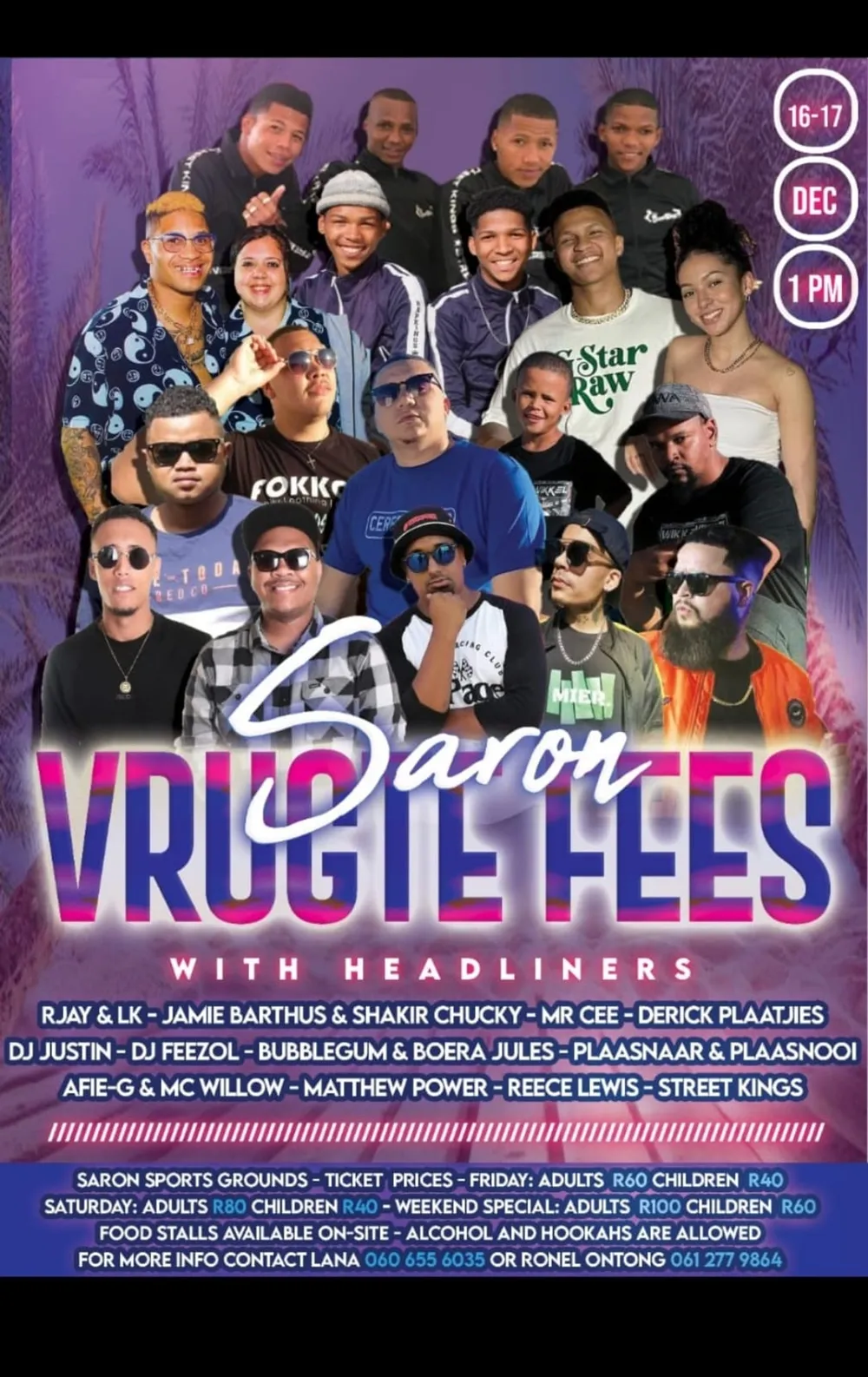 This weekend, the annual two-day Saron Vrugte Fees takes place at the Saron Sportsground. Catch all your favourites in one place such as RJAY & LK, DJ Feezol, DJ Justin, Plaasnaar, Matthew Power, Jamie Barthus, Bubblegum, Street Kings and more. Gates open on Friday and Saturday at 1pm.