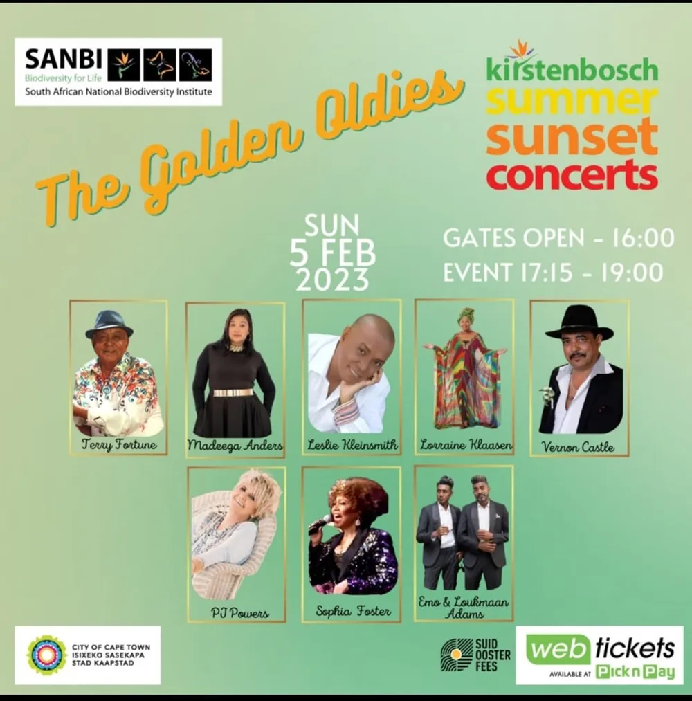 The Golden Oldies music collective includes local legends like Fortune, Madeegha Anders, Leslie Kleinsmith, Vernon Castle, PJ Powers, Lorraine Klaasen, Sophia Foster and the Darryl Andrews Show Band, with brothers Loukmaan and Emo Adams as emcees on Sunday afternoon.