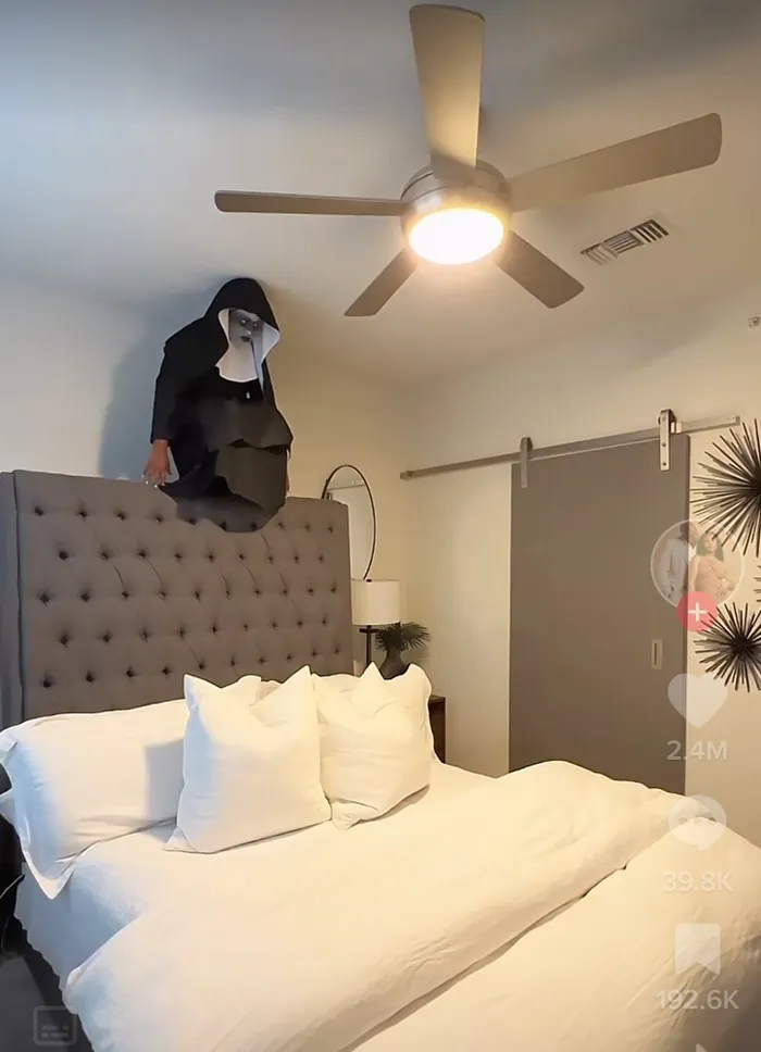 A hilarious TikTok video of a wife pranking her husband by dressing up as the scary nun from the horror movie ‘The Conjuring’ has gone viral.