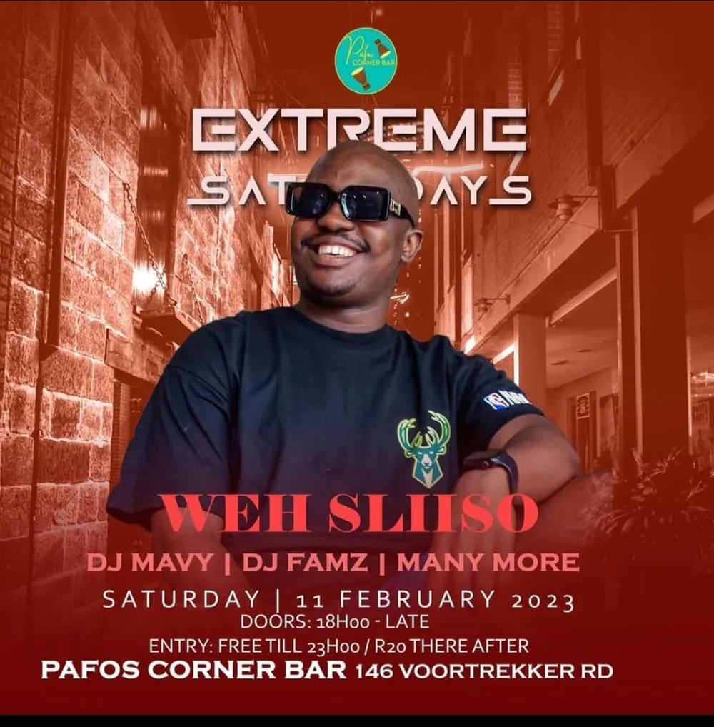 Presenting Extreme Saturdays featuring Weh Sliso, DJ Famz and many more at Pafos Corner Bar. Entry is free until 11pm, R20 thereafter. Doors open at 6pm.
