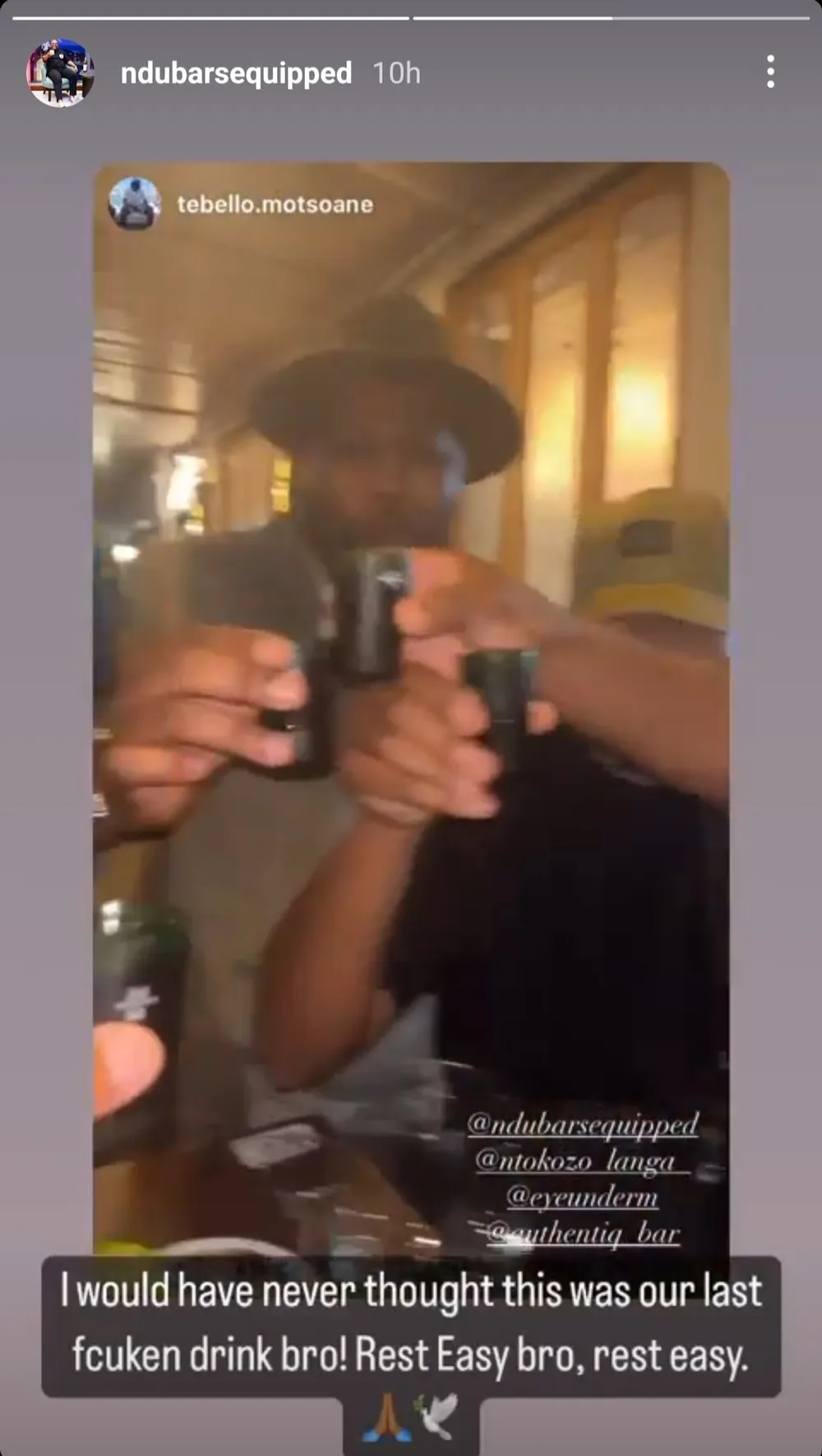 Co-founder of AuthentiQ Bar & Restaurant Ndumiso Mncwabe took to his Instagram account to express his sadness over the loss of Motsoane. Mncwabe was one of the people who were with him before his death.