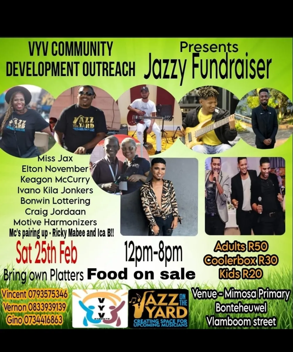 VYV Community Development Outreach presents a jazzy fundraiser featuring Craig Jordaan, Bronwin Lottering, Keagon McCurry and more local artists. The place to be is Mimosa Primary in Bonteheuwel. Bring your own platters although food will be on sale. 12pm until 8pm.Tickets cost R50 for adults, R20 for kids. R30 for corkage.