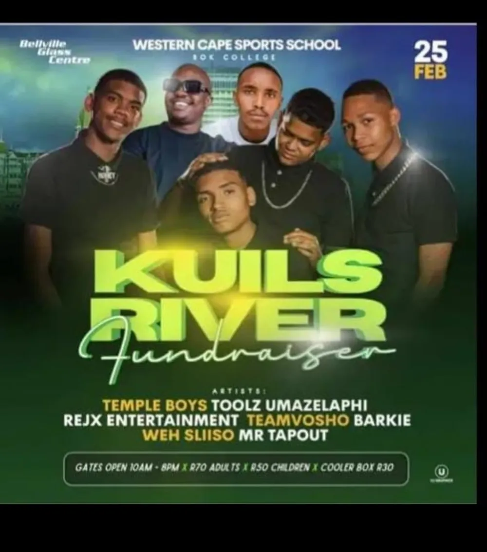 Presenting the Kuils River Fundraiser on Saturday with the Temple Boys, Barkie, Mr Tapout, Weh Sliiso, Team Vosho and more. Gates open at 10am until 8pm. Tickets cost R70 for adults and R50 for kids. R30 for coolerbox.