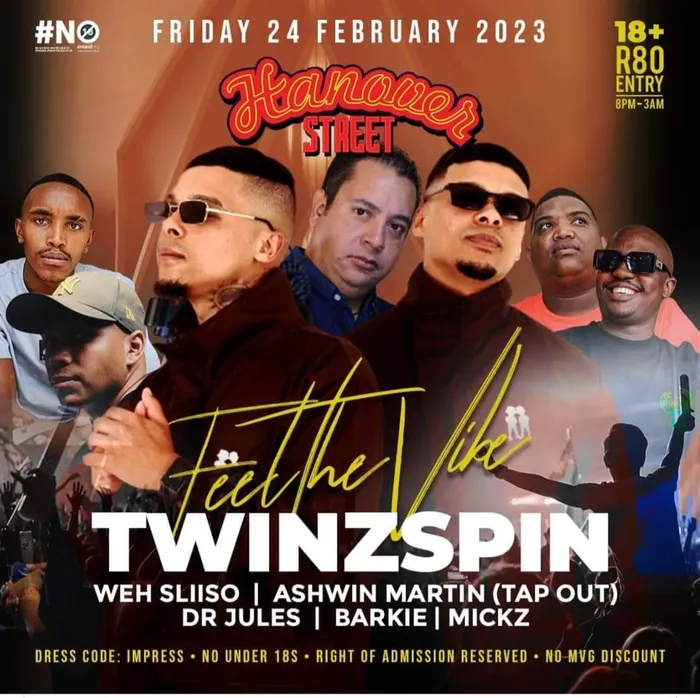 Hanover Street is the plek to be on Friday night, for Twin Spin, Barkie, Weh Sliiso, Mr Tapout, DJ Jules and Micks rocking the stage. R80 entry fee. No under 18s.