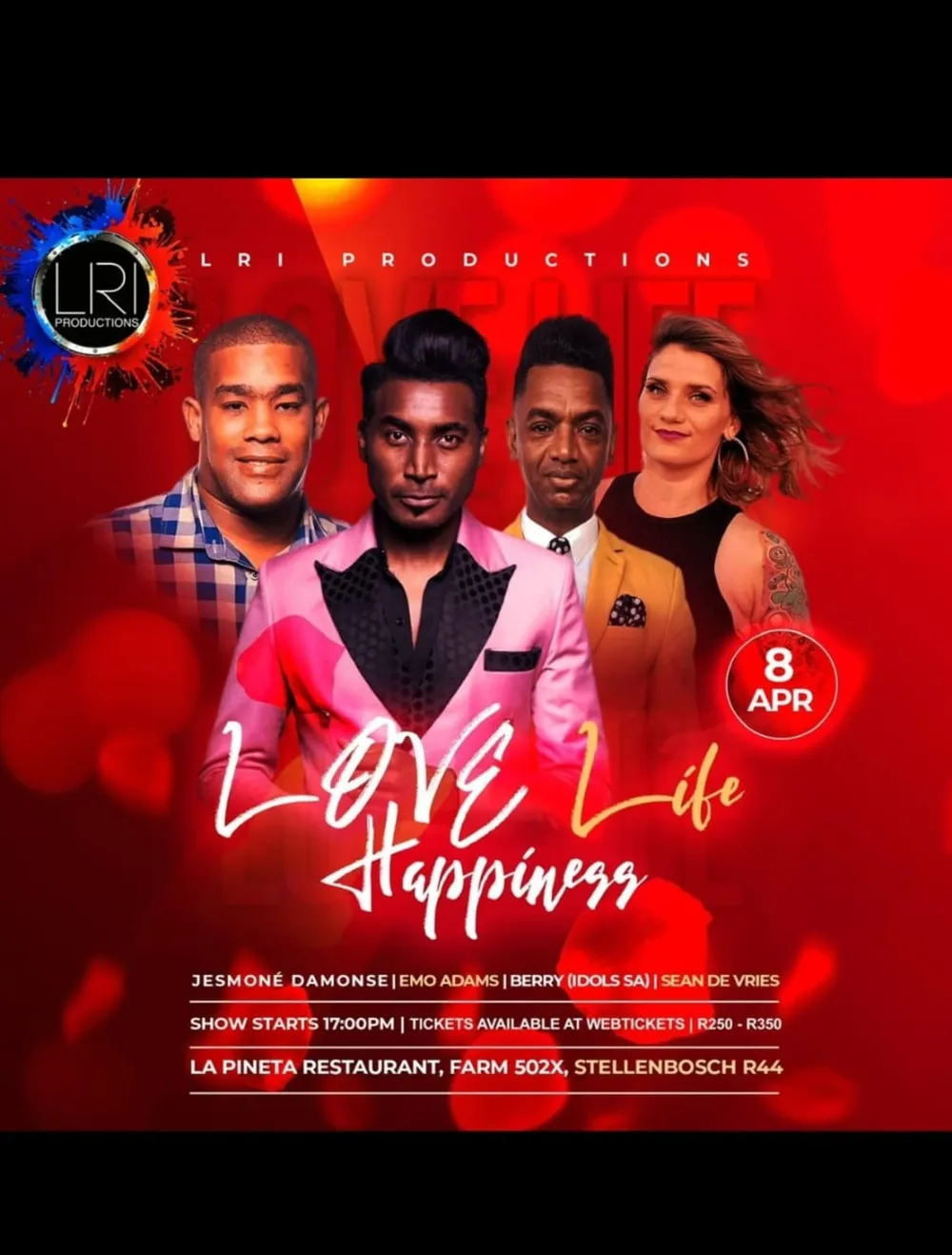 Celebrating love, life and happiness this Saturday with Emo Adams, Berry, Sean De Vries and Jesmone Damonse at the La Pineta Restaurant in Stellenbosch. Tickets are available at Webtickets from R250 - R300.