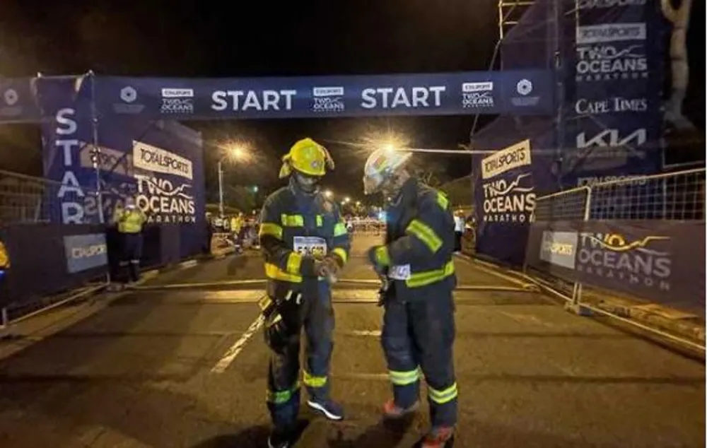 Two Cape Town firefighters went above and beyond the call of duty as they completed the Two Oceans Half Marathon while wearing all of their firefighting gear – alles in the name of charity.