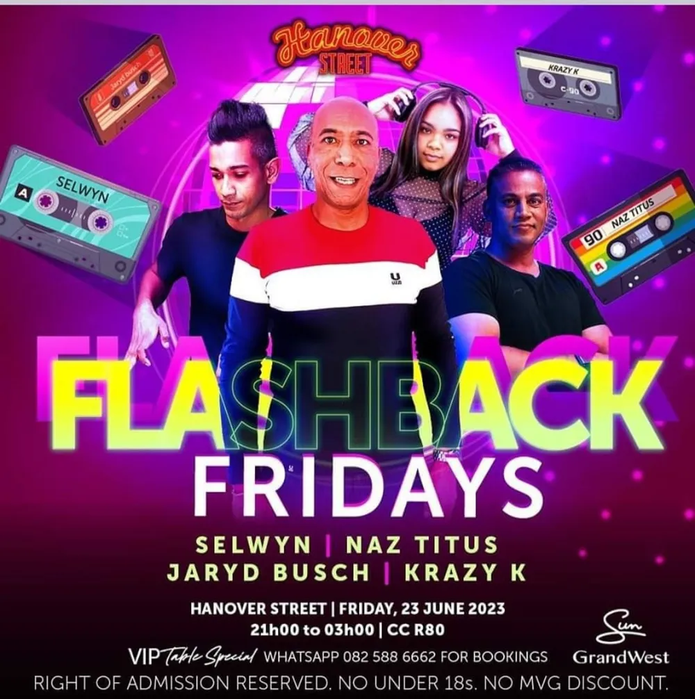 It’s Flashback Fridays at Hanover Street in GrandWest featuring DJs Selwyn, Naz Titus, Jaryd Busch and Krazy K. The jol is from 9pm and entry is R80. To reserve a table, WhatsApp 082 588 6662.