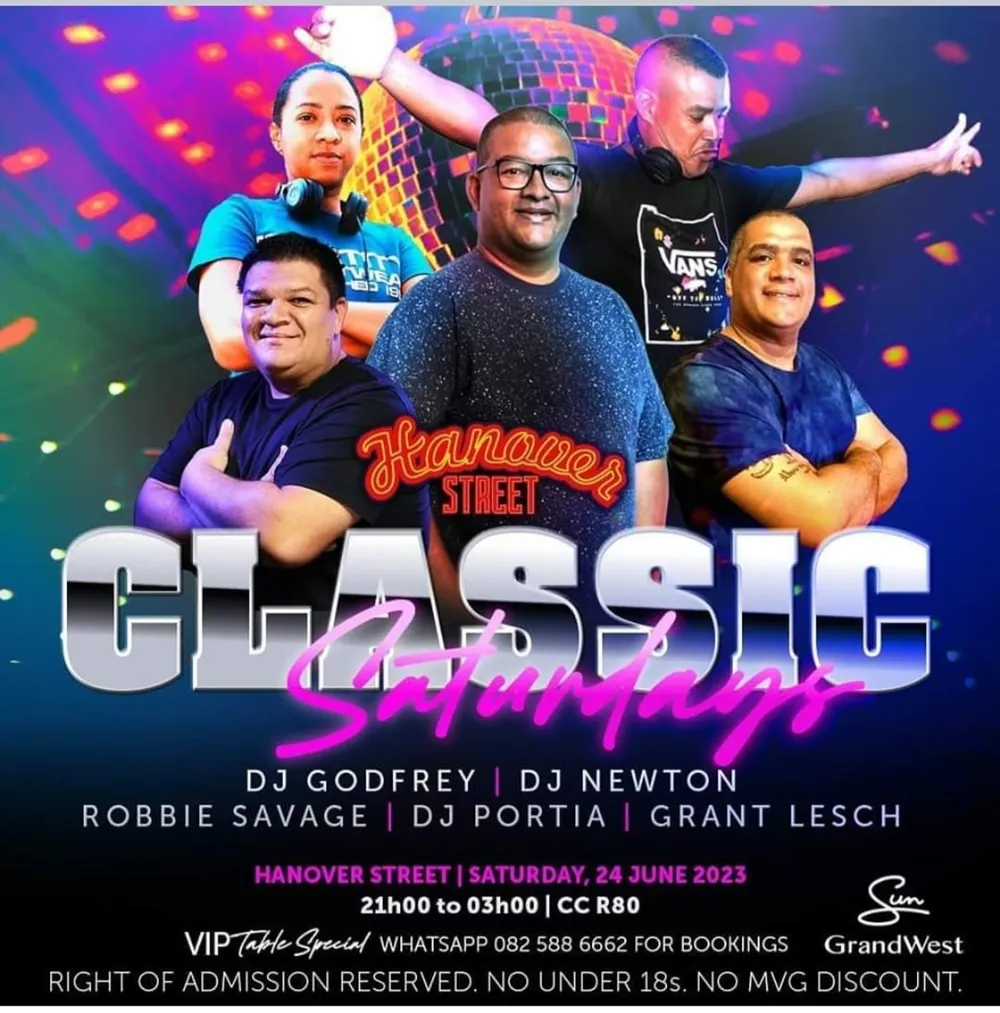 Hanover Street in GrandWest is celebrating Classic Saturdays with DJs Godfrey, Newton, Portia, Robbie Savage and Grant Lesch. The party is from 9pm and entry is R80. To reserve a table, WhatsApp 082 588 6662.