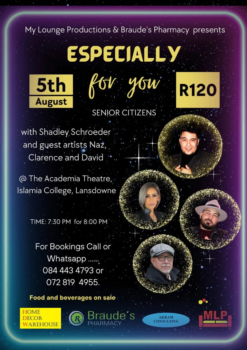 Joining him on stage will be Naz Leeman, David Neal, Clarence Mania and the “Luther Vandross of Cape Town”, Fagrie Isaacs.
