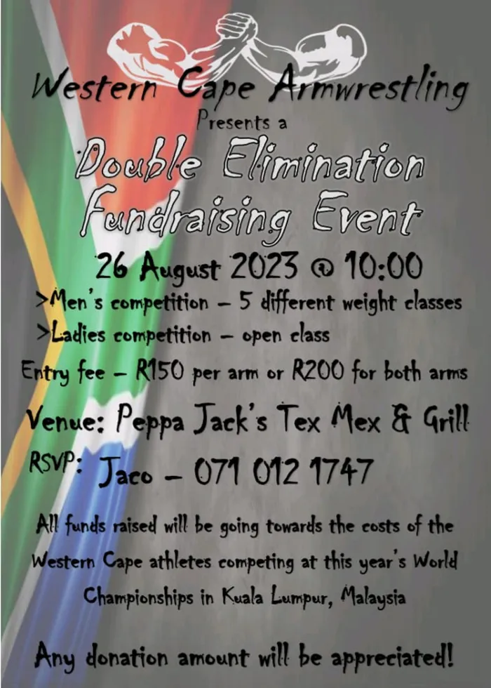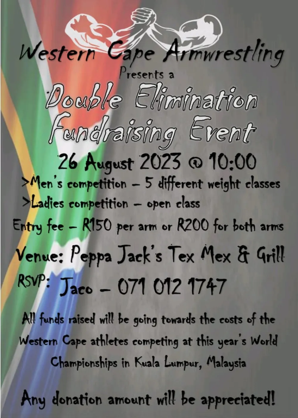 The Western Cape Arm Wrestling presents a Double Elimination fundraising event and the funds raised on the day will go towards the costs of the Western Cape athletes who will be competing at this year’s World Championships in Kuala Lumpur in Malaysia.
