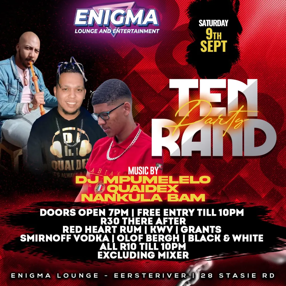 Enigma Lounge and Entertainment presents a Ten Rand Party on Saturday with music by DJ Mpumelelo, Quaidex and Nankula Bam. Doors open at 7pm and entry is free till 10pm then R30 thereafter. Selected drinks such as Red Heart Rum, KWV, Grants and more are all R10 till 10pm.