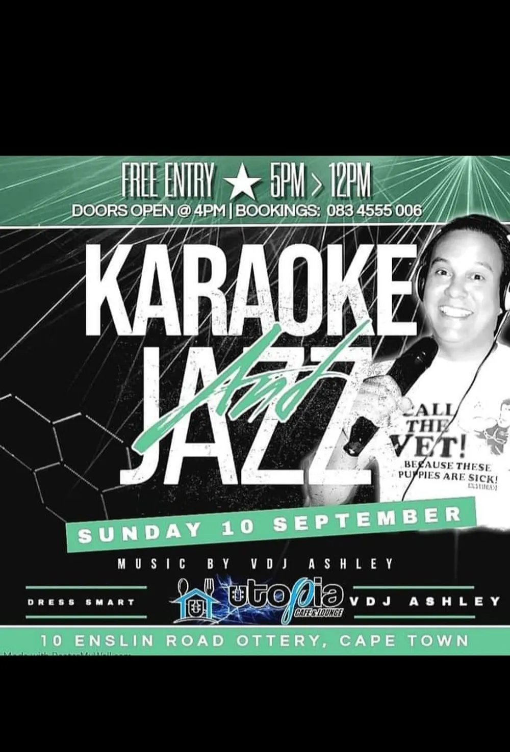 Utopia Cafe and Lounge presents Karaoke and Jazz on Sunday with music by VDJ Ashley. Dress smart, door open at 4pm. For bookings contact 083 4555 006.