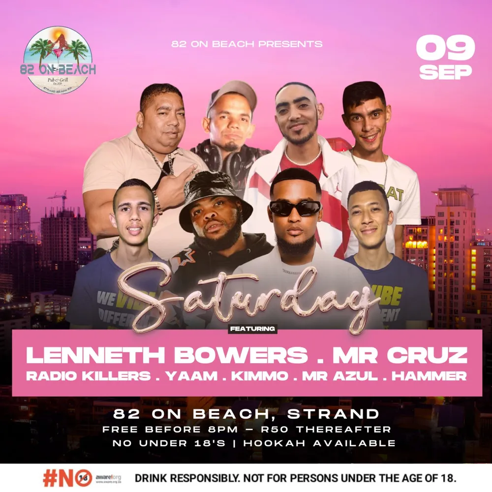 82 on Beach is the place to be on Saturday featuring Lenneth Bowers, Mr Cruz, Radiokillers, Hammer and many more rocking the decks. Entry is free before 8pm and R50 thereafter. No under 18s and hookah available.