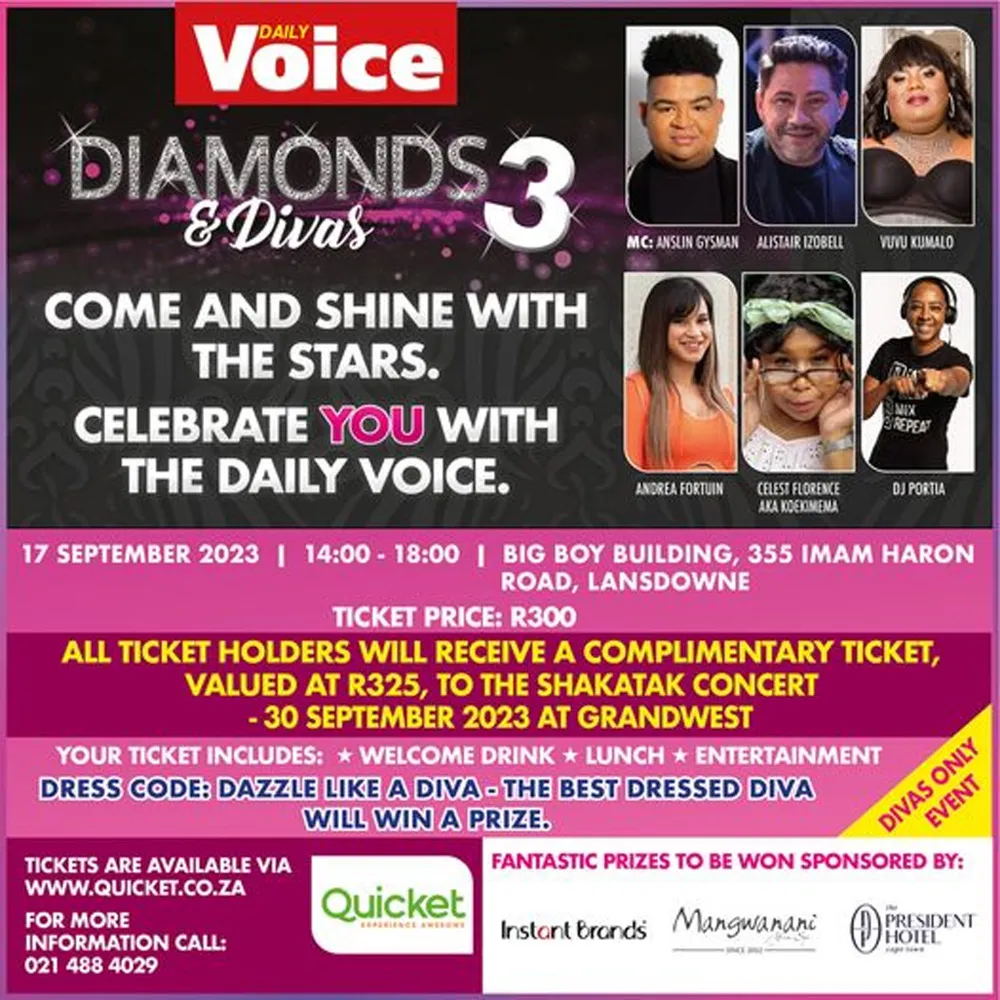 Join the Daily Voice Diamonds & Divas show at Big Boy’s Venue, 355 Imam Haron Road, Lansdowne, on Sunday afternoon, for an unforgettable experience.