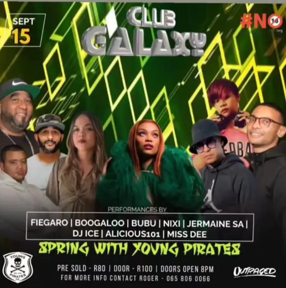 Club Galaxy presents Spring With Young Pirates tonight with music by Bubu, Alicious101, Jermaine SA, Dee and many more. Tickets are R80 pre-sold and R100 at the door.