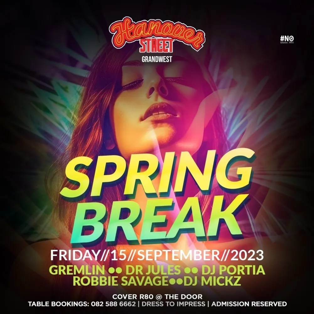 Hanover Street presents Spring Break on Friday night, featuring Gremlin, Dr Jules, DJ Portia, Robbie Savage and DJ Mickz. Entry is R80 at the door.