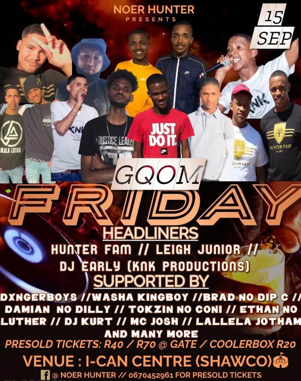 Noer Hunter presents Gqom Friday, featuring headliners Hunter Fam, Leigh Junior and DJ Early supported by DJ Kurt, Washa Kingboy, Dxngerboys and more. The venue is the I-Can Centre in Elsies River. Tickets are R40 pre-sold and R70 at the gate, cooler box is R20.