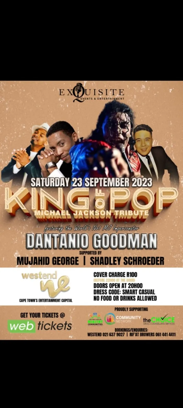 West End is hosting a King of Pop Michael Jackson tribute on Saturday, featuring the world’s No 1 impersonator Dantanio Goodman supported by Mujahid George and Shadley Schroeder. Entry is R100 and doors open at 8pm. Dress code is smart casual and no food or drinks are allowed.