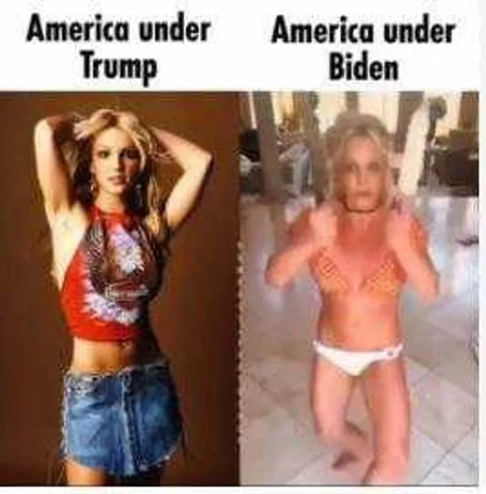 On the left was a kwaai throwback photo of a young Britney posing in a skimpy T-shirt and skirt, labelling it as “America under Trump”.