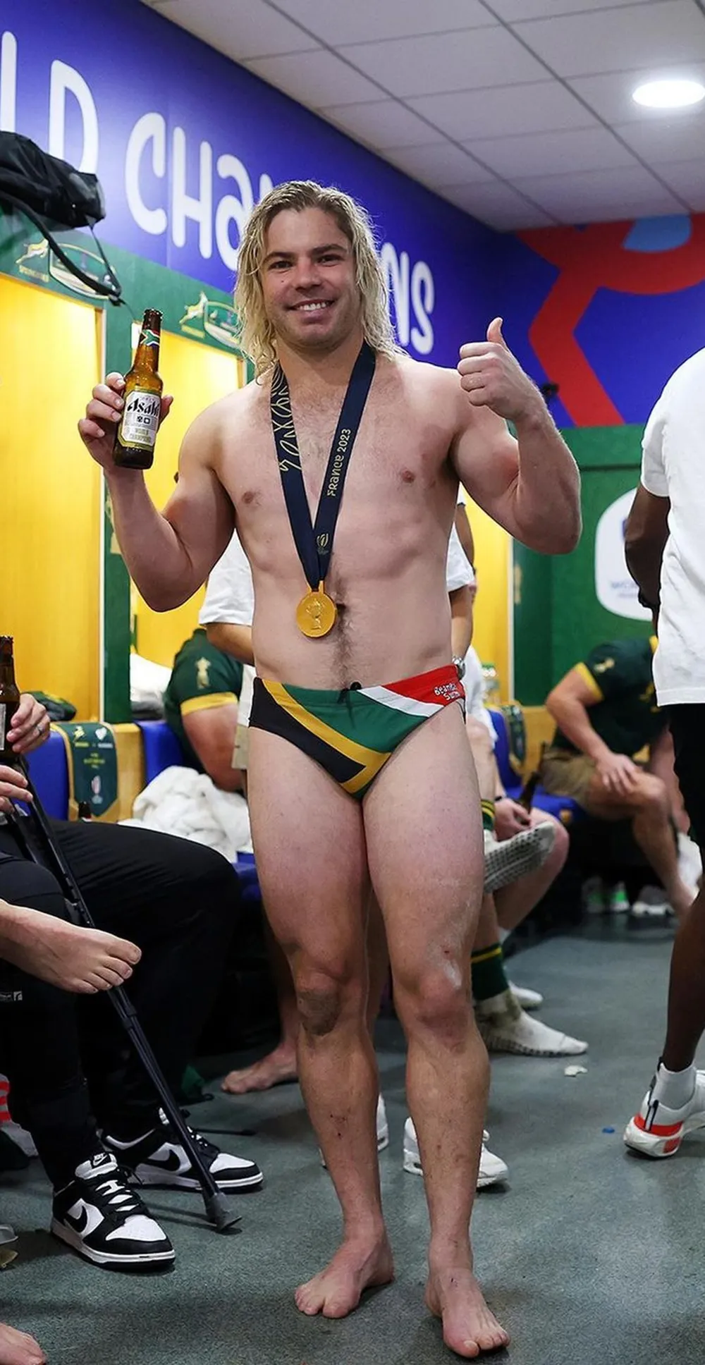 Following the national team’s stress-inducing victory over New Zealand in the Rugby World Cup on Saturday, Faf stayed true to form and once again proudly stripped down in the locker room to only his onnie.