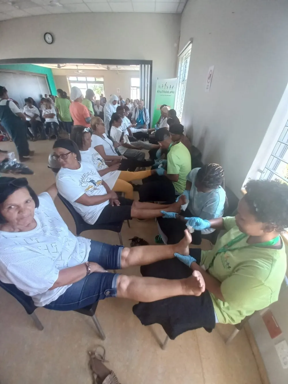 The day was made possible by non-profit organisation Khathalelana who treated 100 seniors to a foot spa, and they all received socks, new takkies, a gift, lunch and dessert, and each got to take bread home.