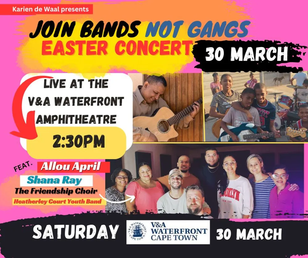 Finally, ‘Join Bands Not Gangs’ is a non-profit that uses music to help fight gangsterism in the Cape Flats and beyond. The organisation’s Mentors Band will be performing alongside the gospel-vocal style Friendship Choir.