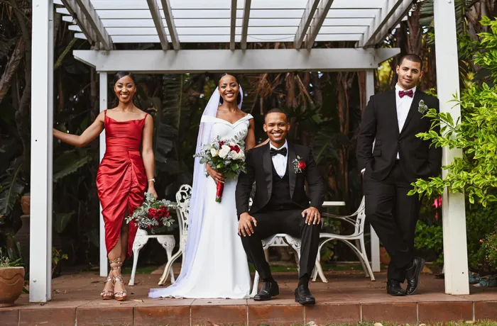 Newly weds: Megan and Jondolar Isaacs. with bridal party Chanelle Saayman and Dean Smith. Picture: All Yours Photography