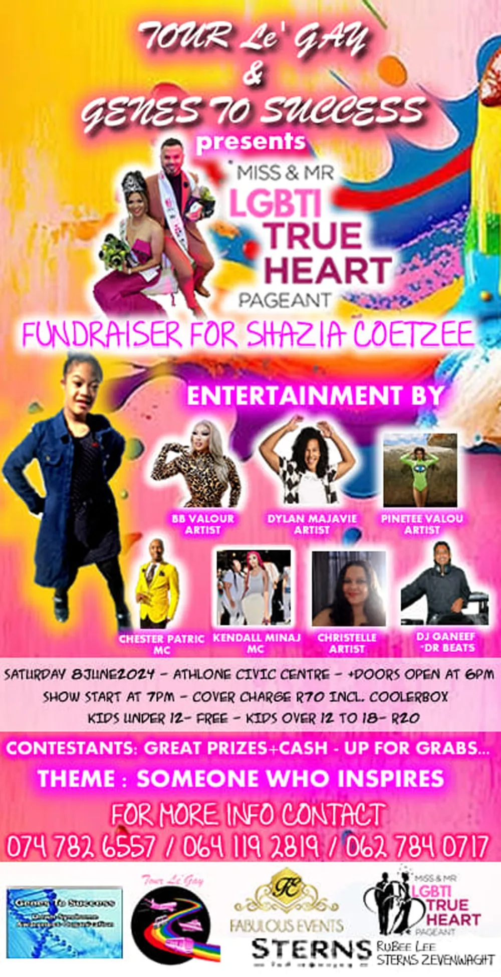 Tour Le’Gay and Genes To Success will now be giving a fundraiser for Shaziah in the form of the Miss and Mr LGBTI True Heart Pageant on 8 June.