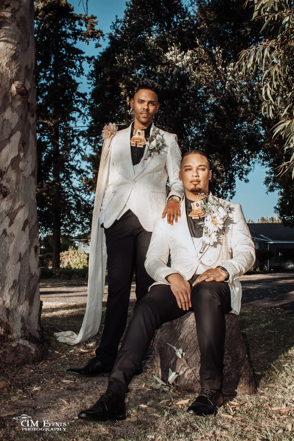 While the guests were all dressed in black, the couple wore matching waist coats and pants, as well as cream blazers, to which Daylin added a bit of drama with a cape flowing from his left shoulder, while Aiden added a few chains on the side of his blazer.