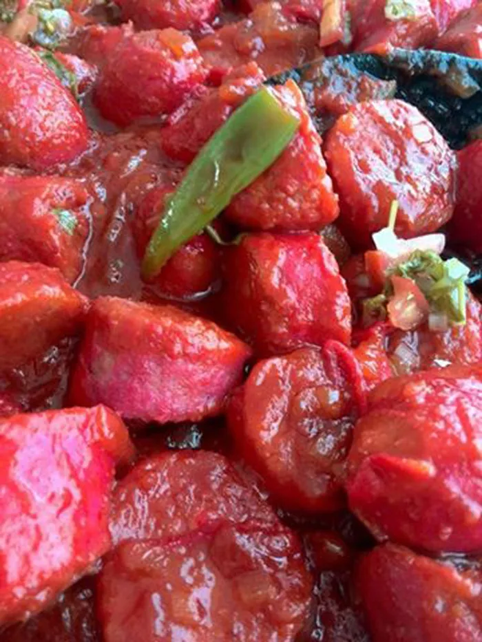 Fry the onions in the oil until golden brown. Add half a cup of hot water and simmer onions for a few minutes. Then add the rest of the ingredients except the warme worsies. Add a cup of hot water and allow the onion and tomato mix to cook until all water has cooked away. Now add the warme worsies and half a cup of hot water and cook and stir on a medium heat for about 5-8 minutes. Drizzle with some sambal or you can add some baked beans as well.