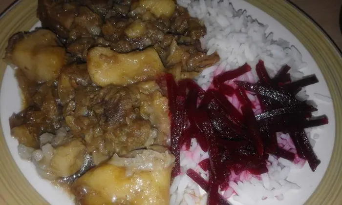 Place washed mutton pieces into a pot with the onions, stick cinnamon and peppercorns. Allow to cook and let meat stick to pot so that when you add water, it will make the meat brown.