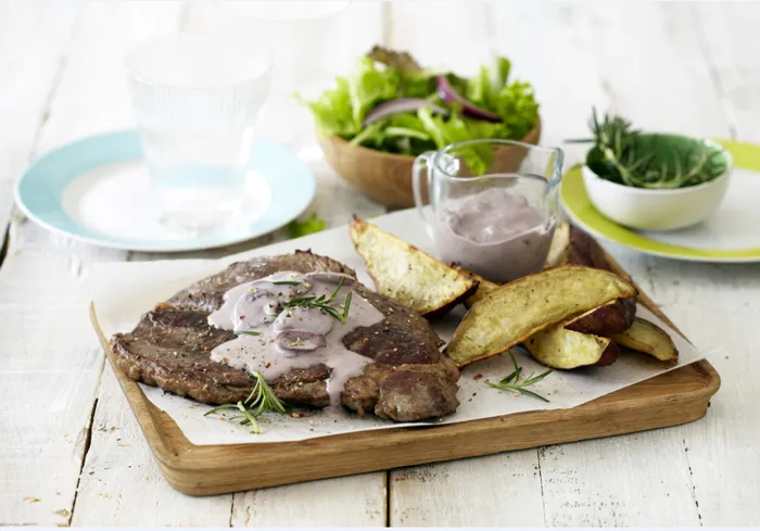 Season the rump steaks and grill or braai, serve with the red wine and Mushroom Sauce, roasted sweet potato wedges and salad.