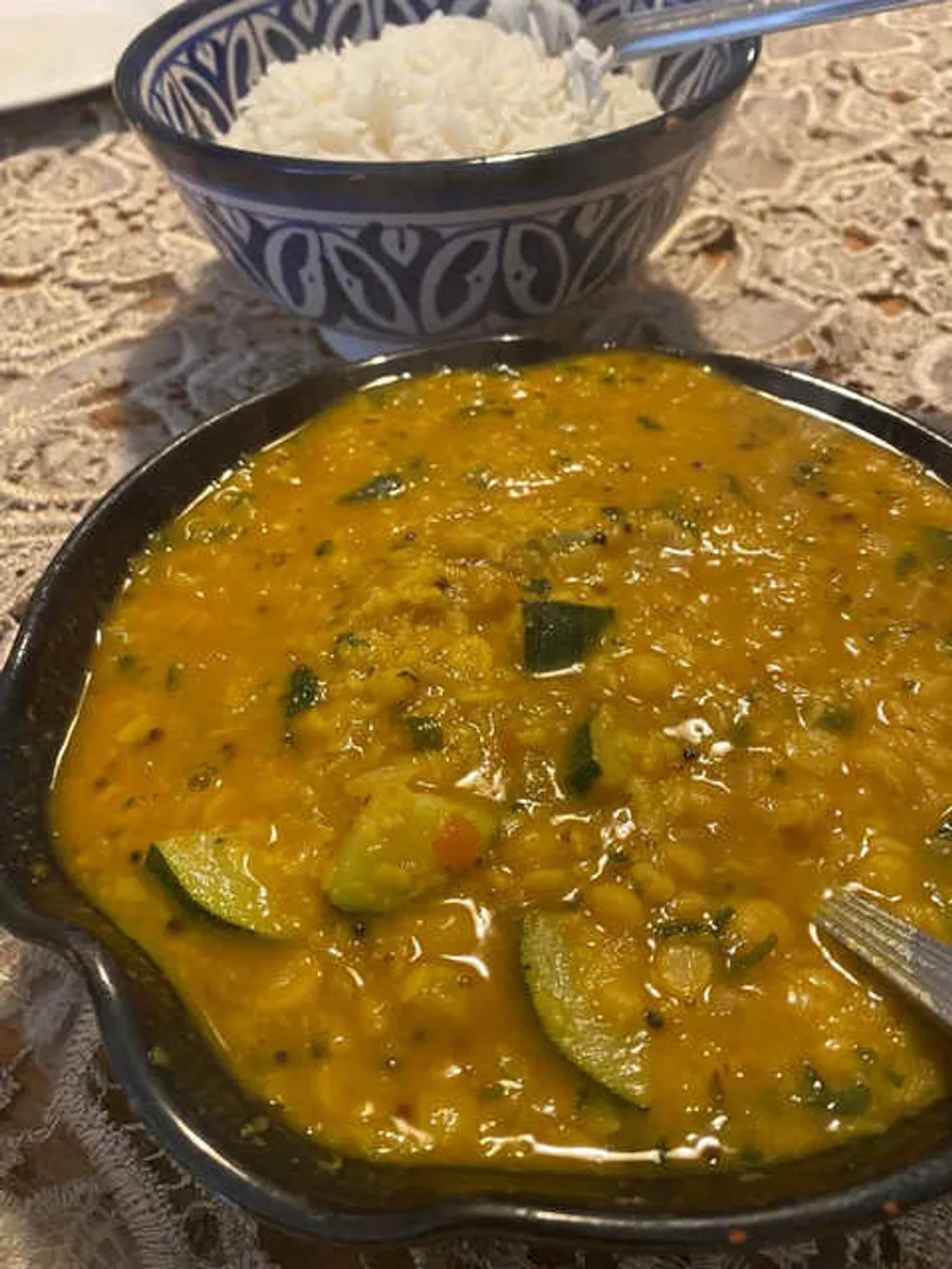 When the dhal is soft and ready, stir onion mixture into dhal.