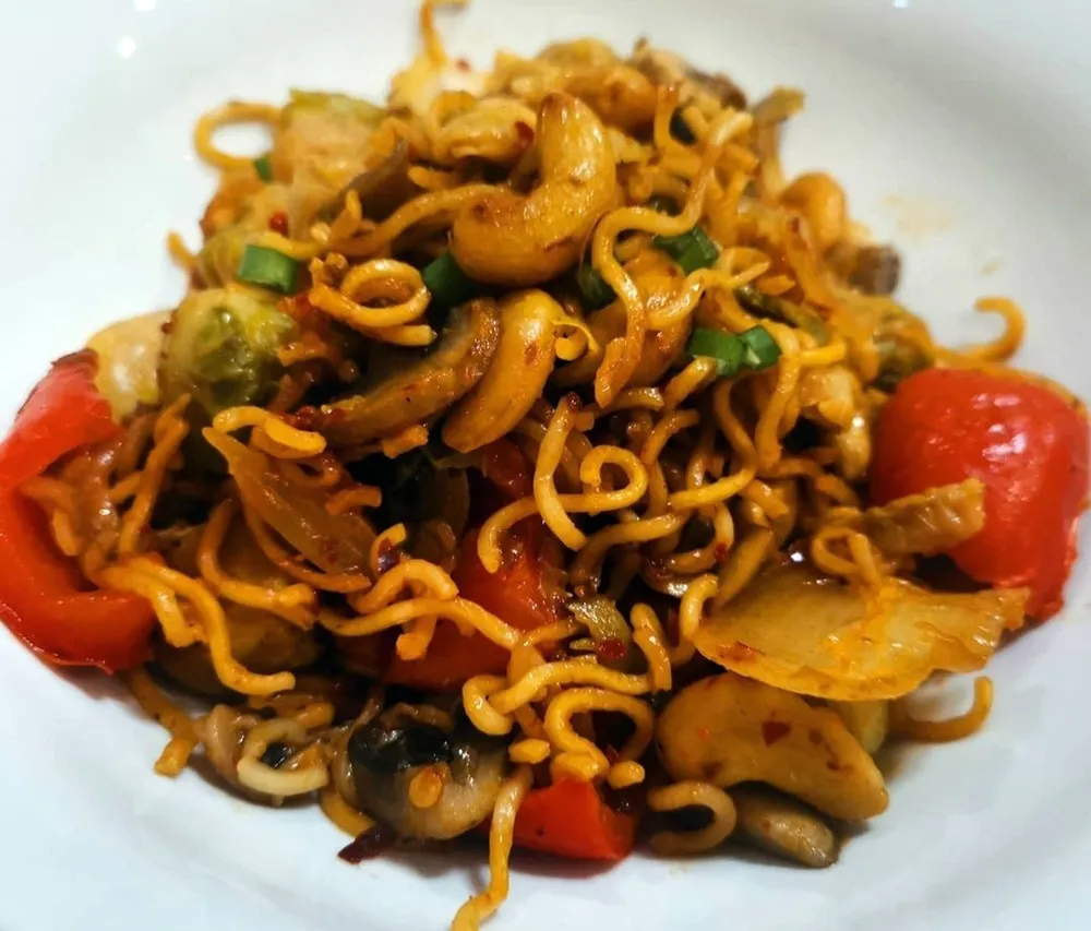Once the veg is crisp and cooked, add the noodles, sauce with water and stir fry for a minute until everything is well coated with the sauce.