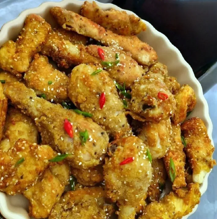 Deep fry in medium to hot oil until golden brown and chicken is cooked.