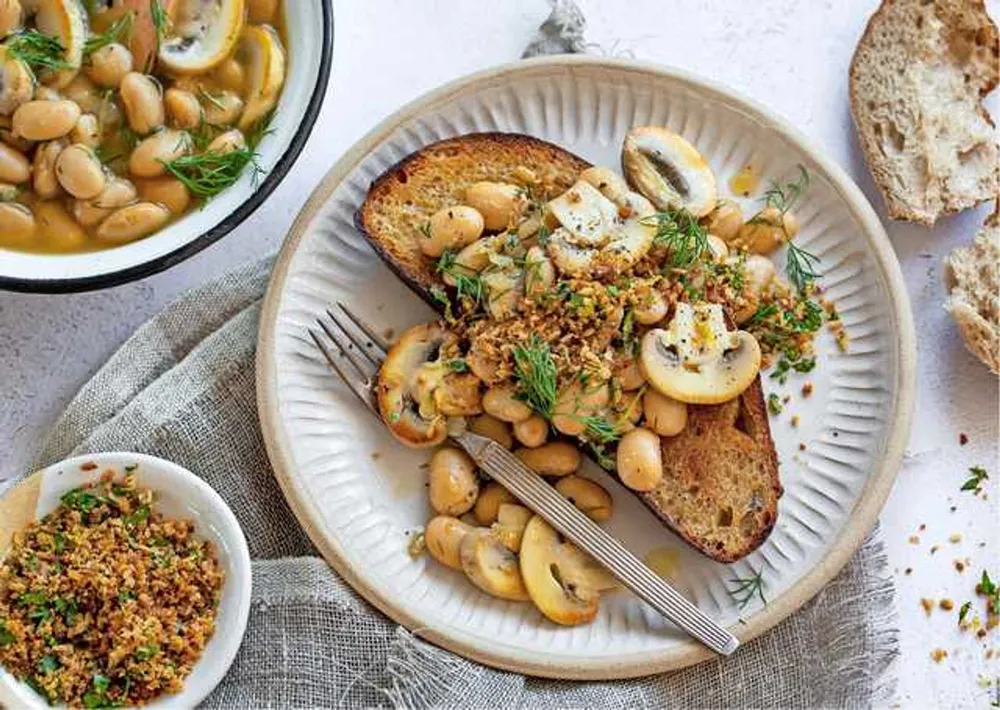 Serve generous spoonfuls of mushrooms and beans over the bread and enjoy.