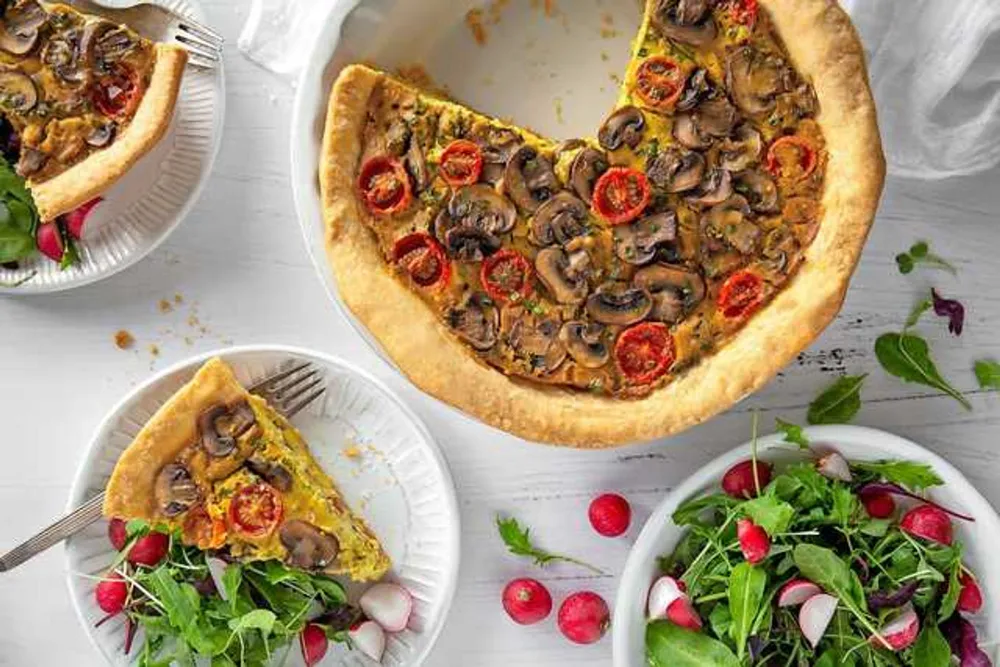Bake the filling at 180˚C for ± 40 minutes until the top is golden brown and the quiche is cooked through and set. Cover with tinfoil if browning too much.