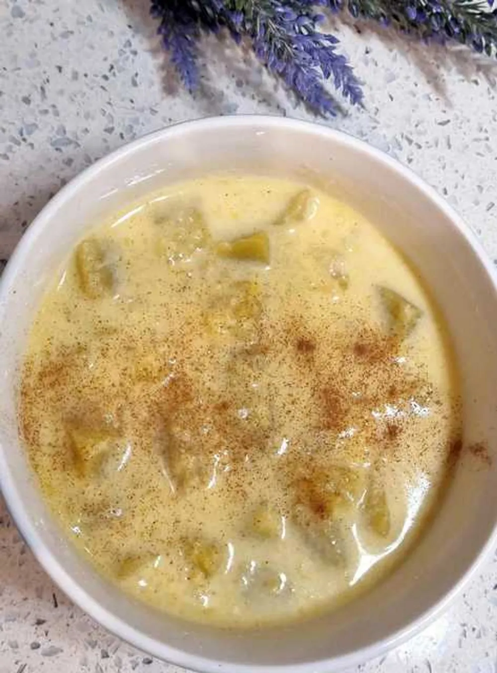 Add the pudding to a greased Pyrex dish and dust with fine cinnamon.