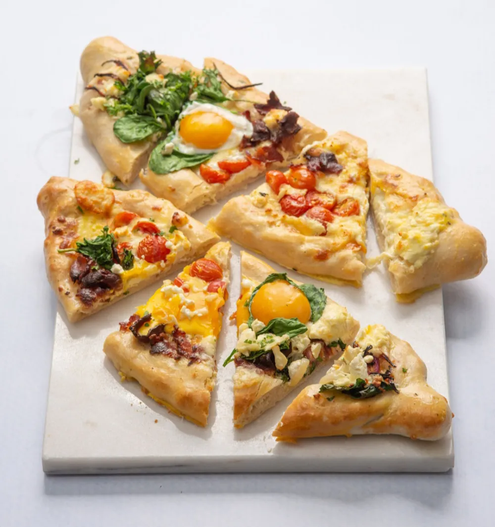 Remove the baking tray from the oven and with a knife, spread out some of the melted cheese in the centre of the pizza boat and crack an egg into it, customise with the toppings of your choice.