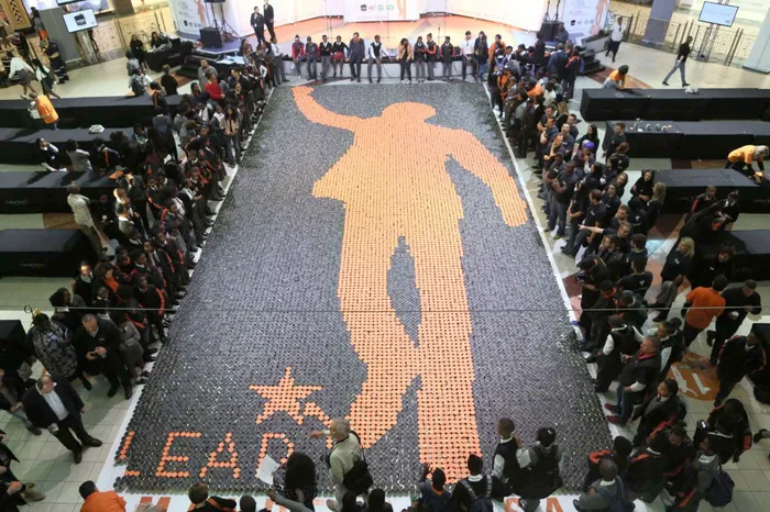 Dozens of volunteers at Canal Walk spent Mandela Day building a giant mosaic of Nelson Mandela using thousands of blikkieskos.