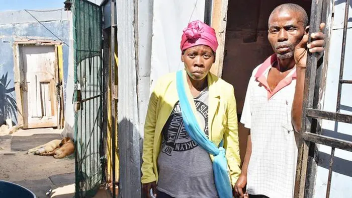 Albert Mxolisi Mhaga, the father, who is still weak and has difficulty in walking, with his distraught and grieving wife, Nophelo Sofia Ngqiba, outside their house in Philippi. CREDIT: Jason Boud/ANA Pictures Albert Mxolisi Mhaga, the father, who is still weak and has difficulty in walking, with his distraught and grieving wife, Nophelo Sofia Ngqiba, outside their house in Philippi. CREDIT: Jason Boud/ANA Pictures