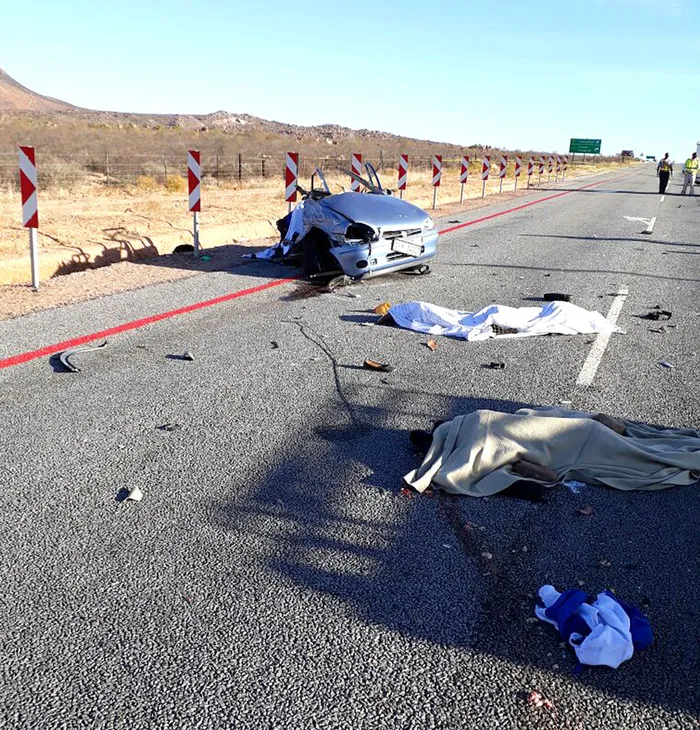 SCENE: Dead bodies covered on the N7 road outside Klawer after the driver of an Opel Corsa bakkie collided with a bus. CREDIT: Supplied SCENE: Dead bodies covered on the N7 road outside Klawer after the driver of an Opel Corsa bakkie collided with a bus. CREDIT: Supplied