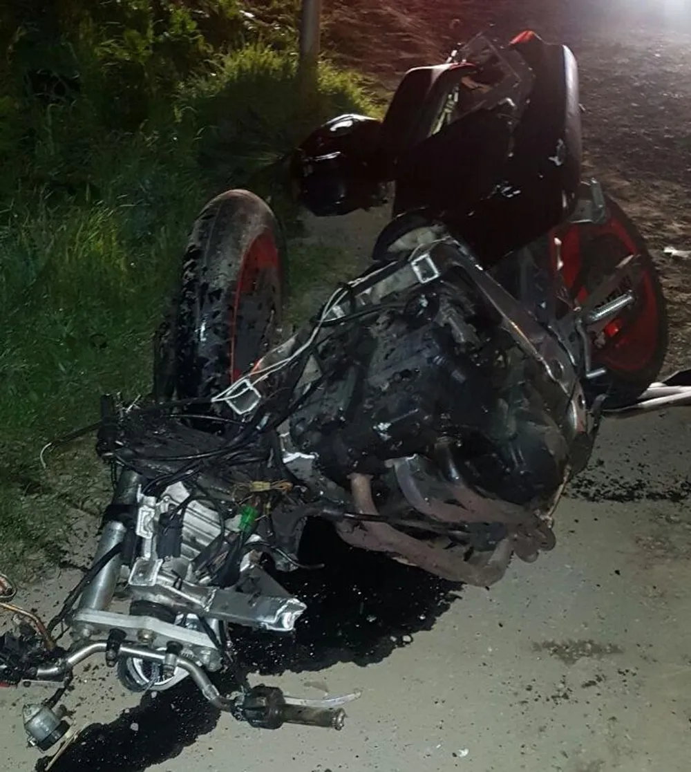 The impact of the crash on Tuesday caused the ambulance’s windscreen to shatter and the front bumper to fall off, while the black Suzuki bike with red rims was crushed.