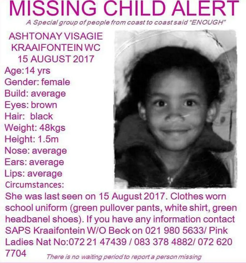 Ashtonay Visagie, 14, also disappeared while wearing a green jersey, pants and white T-shirt and green headband and shoes.