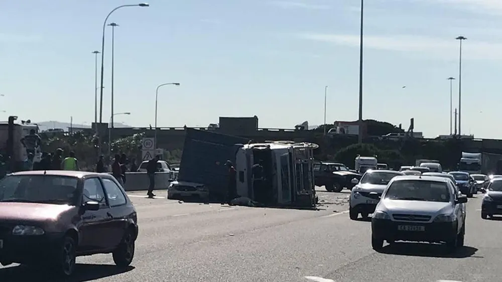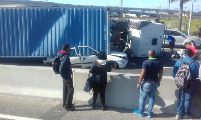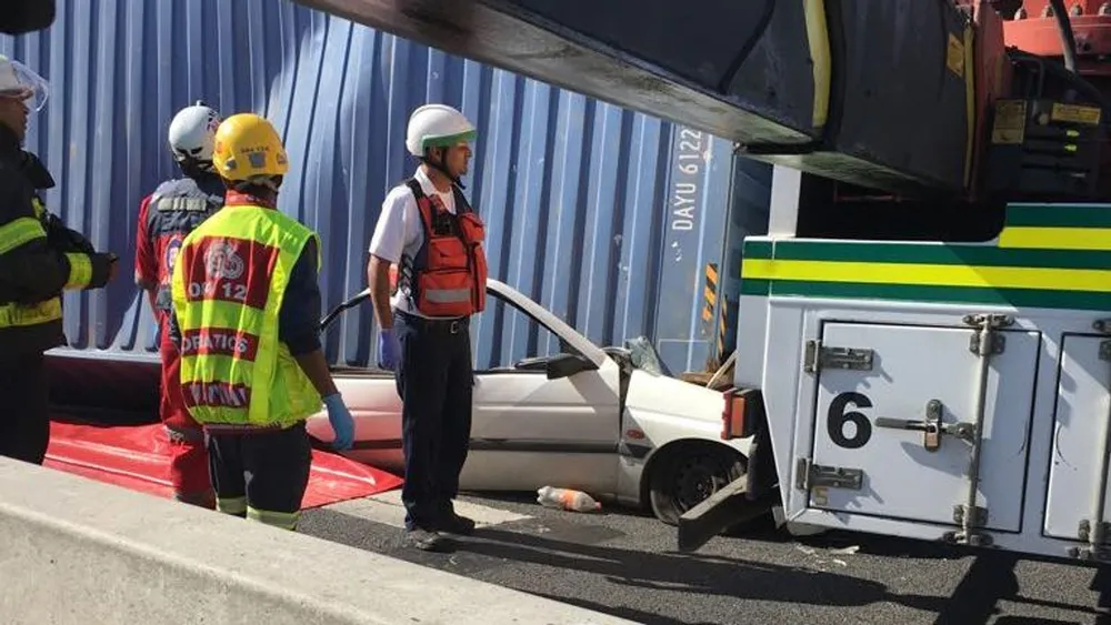 ER24 paramedics, along with Metro and Life Healthcare, arrived on the scene to find the truck and trailer in the fast lane of the highway. A light motor vehicle had been completely crushed beneath a container that had been on the trailer.