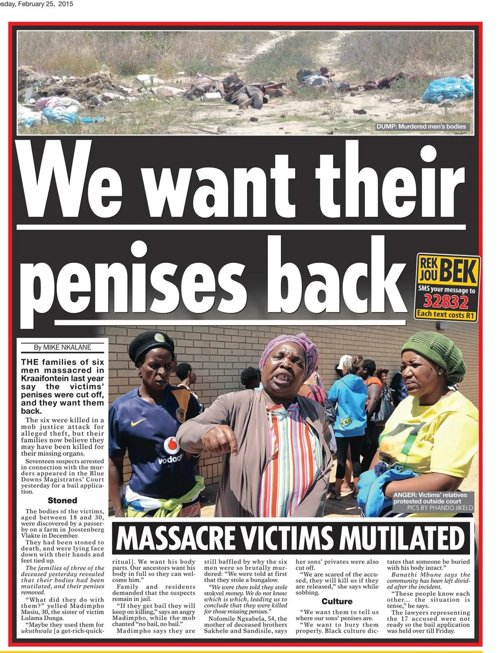 Zola Gayiya, Emanuel Barnes, Sandile Ngxabela, Sakhele Ngxabela, Lulama Dunga and Mhlanganisi Mljanjeni were then taken to Redhill in Joostenberg Vlakte where they were tied up, stabbed with a sword and other sharp objects, and crushed with rocks and bricks.
